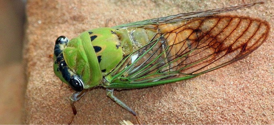 De color verde. Un par de antenas muy cortas en la cabeza, y un par de grandes ojos compuestos, de color negro y muy separados entre sí. Parte superior del tórax de color verde hierba, con manchas negras simétricas. Alas transparntes, de venas entre verde y negro. Abdomen que pasa de verde a amarillo.