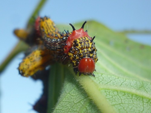 Cabeza de la larva cápsula roja. Extremo posterior del tórax con una protuberancia roja.