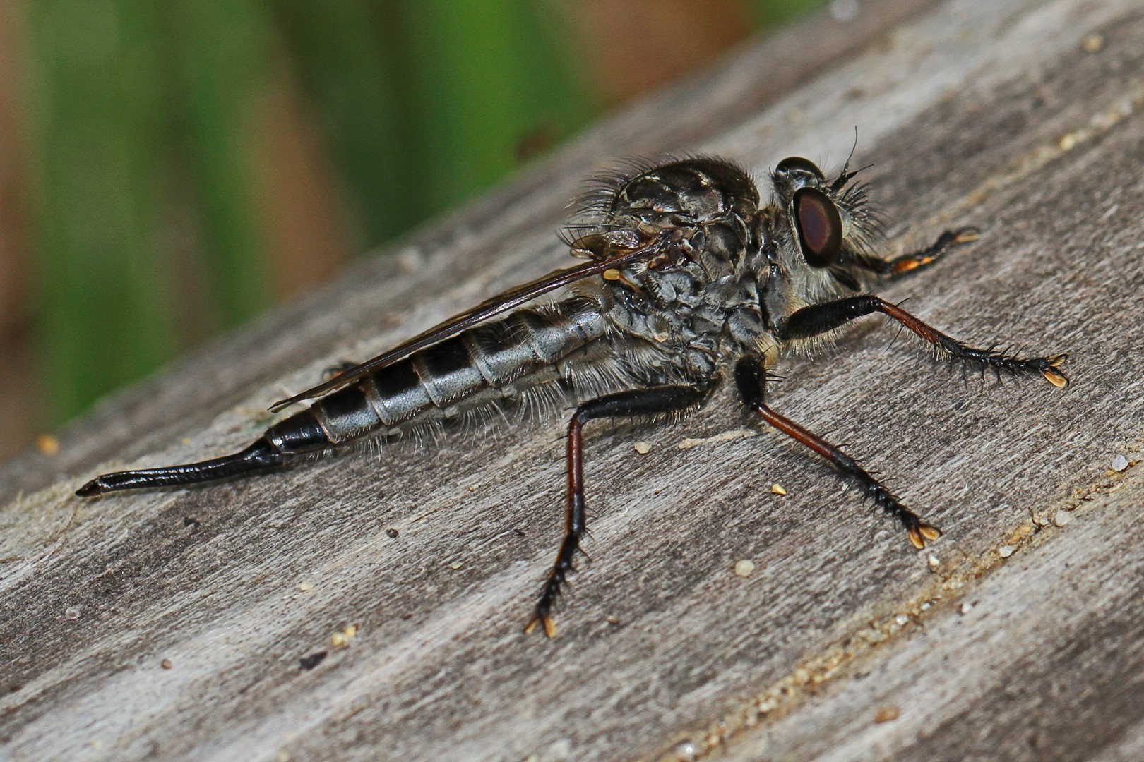 Moscas ladronas de tamaño pequeño a grande (10–40 mm) con una forma claramente diferente del extremo posterior del abdomen en machos frente a hembras. Las hembras tienen un ovipositor corto o largo que no tiene pelo y es cónico corto a delgado en forma de cuña, su color suele ser negro brillante. Los machos tienen una "cola de helicóptero" con cierres negros brillantes cubiertos de pelos. La coloración abdominal suele ser de grisáceo a parduzco en las mujeres, en contraste con más contraste con segmentos o parches plateados y / o negros en los hombres. Las alas son claras o uniformemente teñidas, con tintes que varían del marrón transparente al negro oscuro. La venación incluye una vena recurrente en R1, una celda estrecha r4, R4 que se extiende más o menos paralela a R5 o que converge moderadamente con R5 hacia la punta del ala.