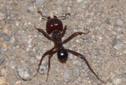 Dinergate, strong. Overall reddish-brown. Head big. Maxillae strong. A pair of geniculate antennae on the head. 3 pairs of walking legs attached to the thorax.