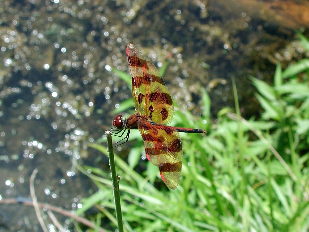 Male, brighter-colored than female individuals, overall red. Compound eyes, pterostigmata, and longitudinal stripes on dorsal body all red. Pagina uniquely dark brown patterned.
