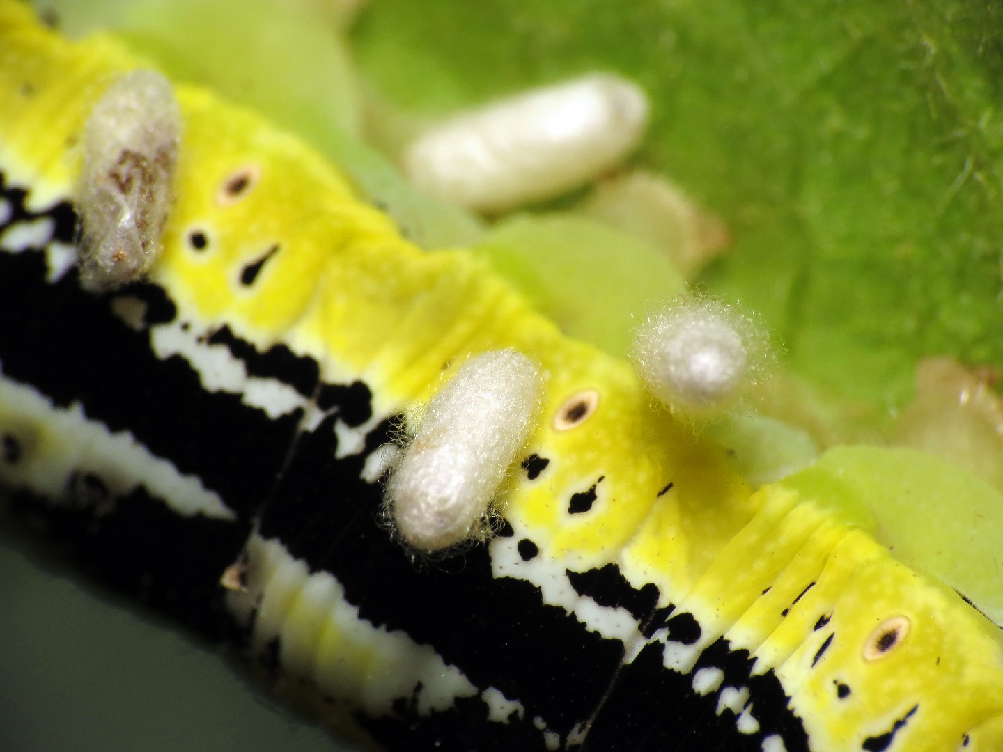 Hornworm parasitic wasp (Cotesia congregata) Hornworm parasitic wasp (Cotesia congregata) Photo By Katja Schulz , used under CC-BY-2.0 /Cropped and compressed from original
