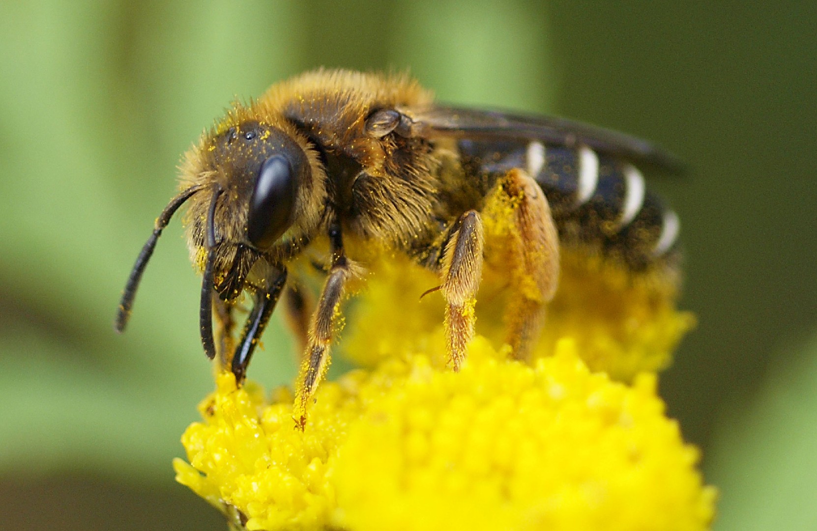 Head and thorax yellow pubescent. A pair of geniculate antennae on the head. Compound eyes reniform. Mandibulate-lapping mouthparts. Membranous wings and 3 pairs of legs attached to the thorax. Abdomen white annularly-striped.