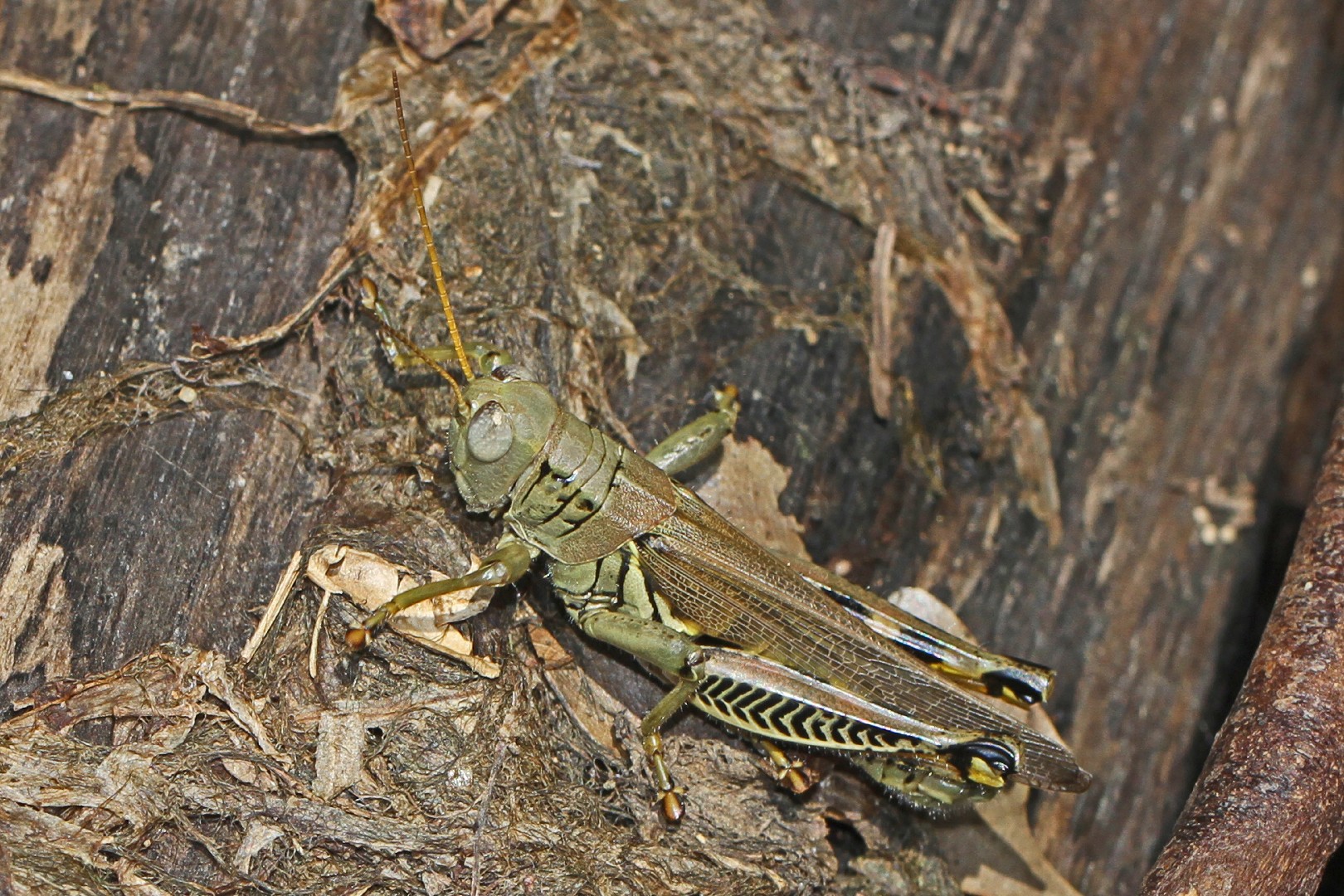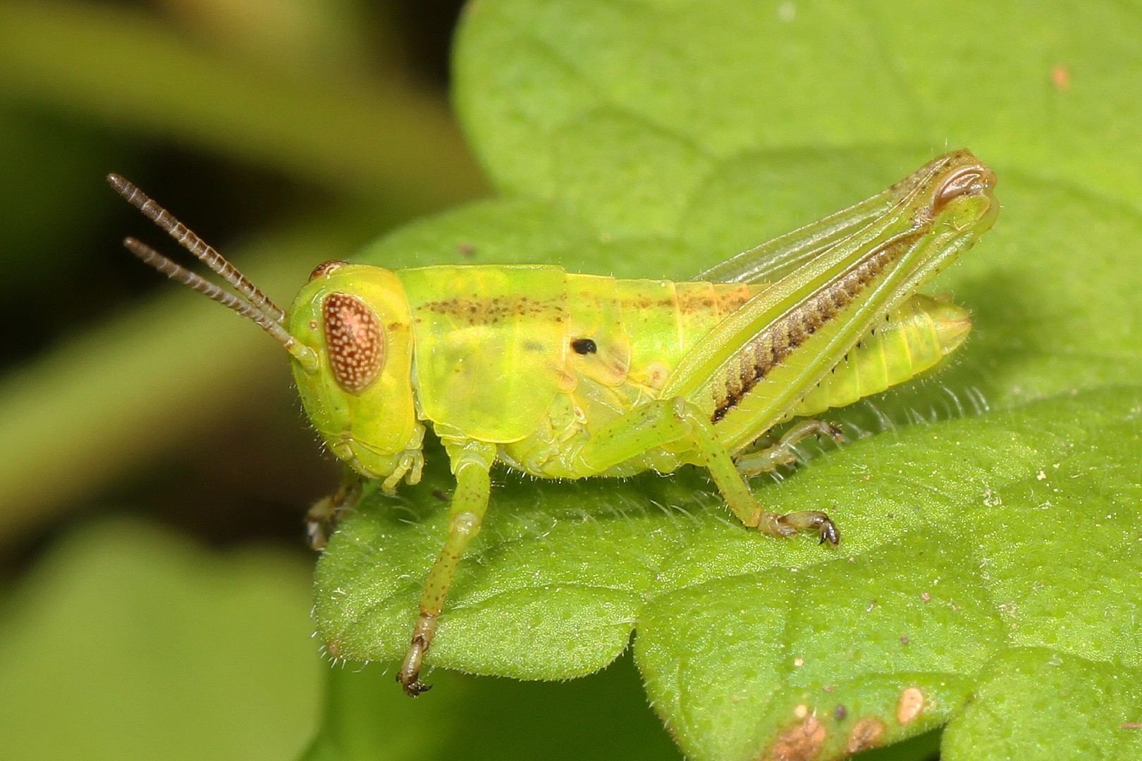 A pair of filiform antennae, clearly segmented. Compound eyes big. Pronotum saddle-shaped. Wing translucent, veins clear. 3 pairs of legs, pleopods strong jumping legs, demur patterned with unique continuous V-shaped spots.