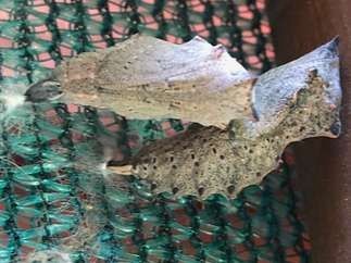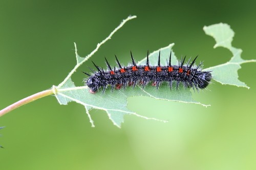 Larva head capsule black. Body black, with black scoli and white hairs. Dorsal line black, with bright red spots on it. Prolegs red.