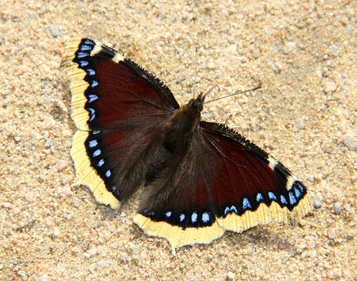 A pair of antennae on adult head. A pair of compound eyes. Siphoning-sucking mouthparts. Pagina crimson, wing margin with wide yellow banded region and blue spots. Forewing costal margin black, with a few yellow spots.