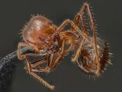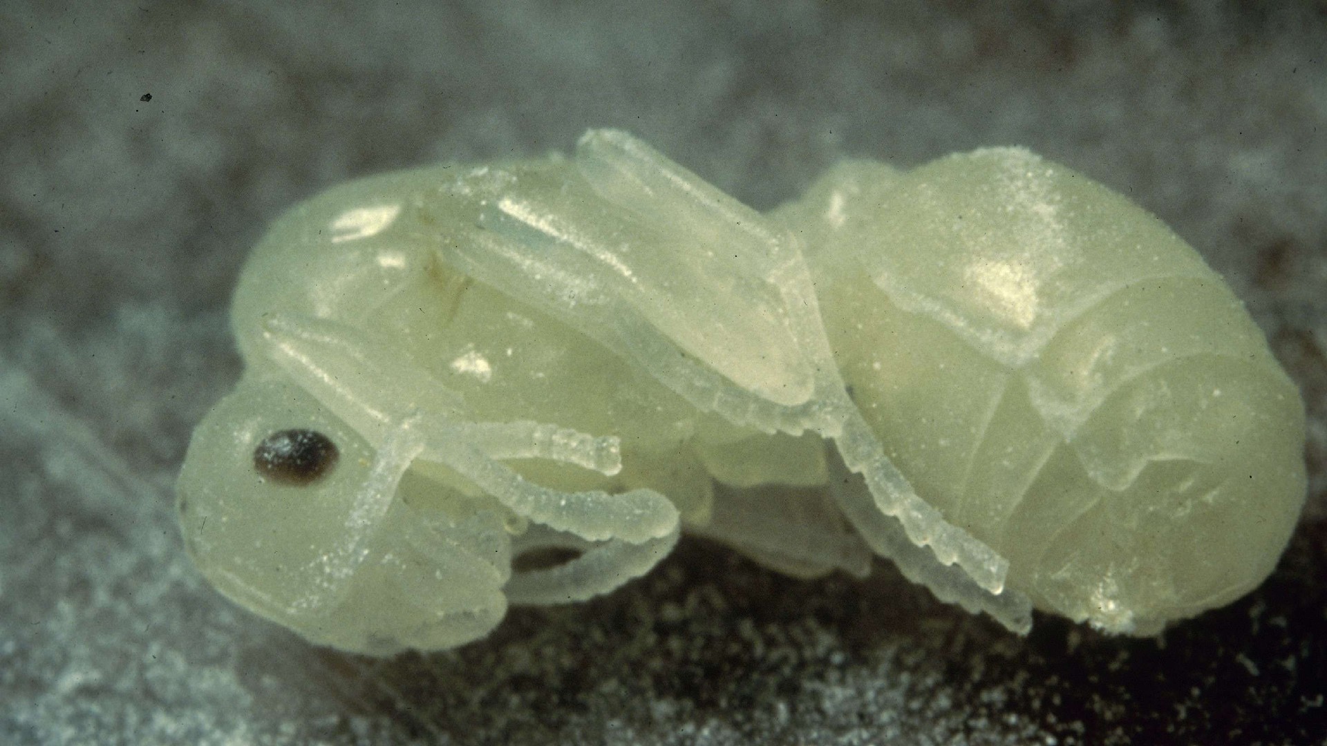 Body small. Overall reddish-brown. Head big. Abdomen gourd-shaped, 3 pairs of walking legs attached to it. Abdomen swollen, dark-colored, with two dentate protuberances at the thorax and abdomen juncture.