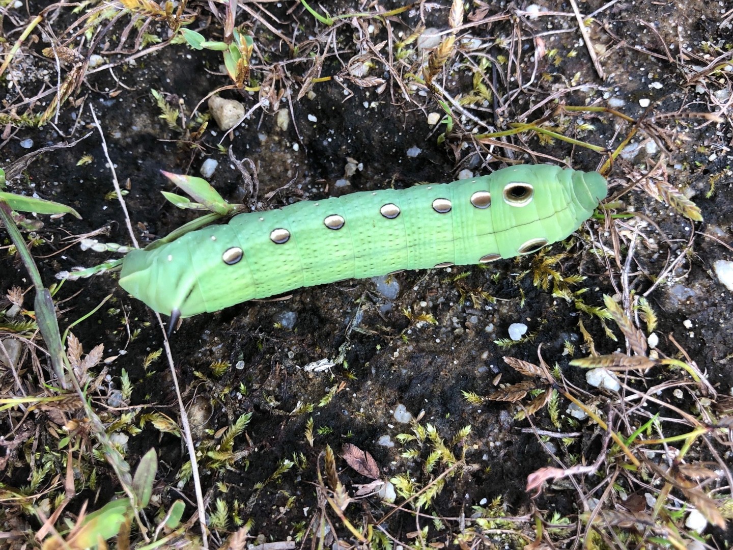 Larva body colors differ by different habitat environments, with green and dark brown commonly seen. Each segment in the middle of body has a unique eyespot. Caudal horn at the rear end of body dark-colored.