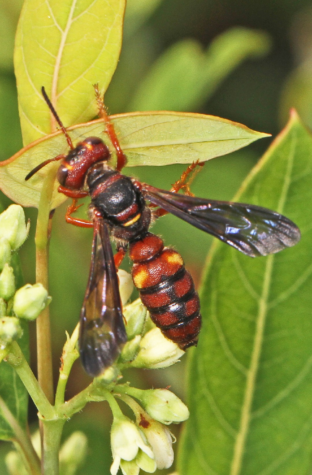 The faces of the females are frequently modified with unusual projections on the clypeus and the clypeal margin which can take the shape of conical bulges to elongated curving "horns". Paralyzed prey are carried in the females' mandibles, which are somewhat elongated and tend to have prominent teeth, often with species-specific shapes. The abdominal segments are also constricted very strongly at the junctures, giving the abdomen a somewhat corrugated, accordion-like appearance.