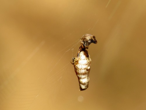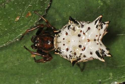 雌性較為常見。身體分為頭胸部和腹部。頭胸部為棕黑色。腹部白色,背部側邊具刺狀構造,向斜上方突出,表面粗糙且不均勻,有黑色和深紅色條紋。